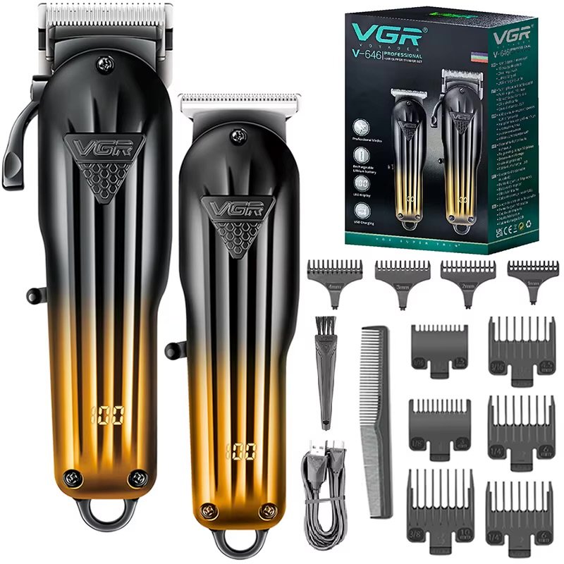 مجموعة ماكينة قص الشعر الاحترافية القابلة لإعادة الشحن VGR V-646، شفرة معدنية مسحوقة، شاشة رقمية، 10 مشط توجيه، مشط مستدق، تعديلات على المقص وقاطع على شكل حرف T، وقت تشغيل مشذب 200 و120 دقيقة