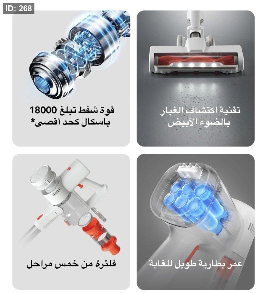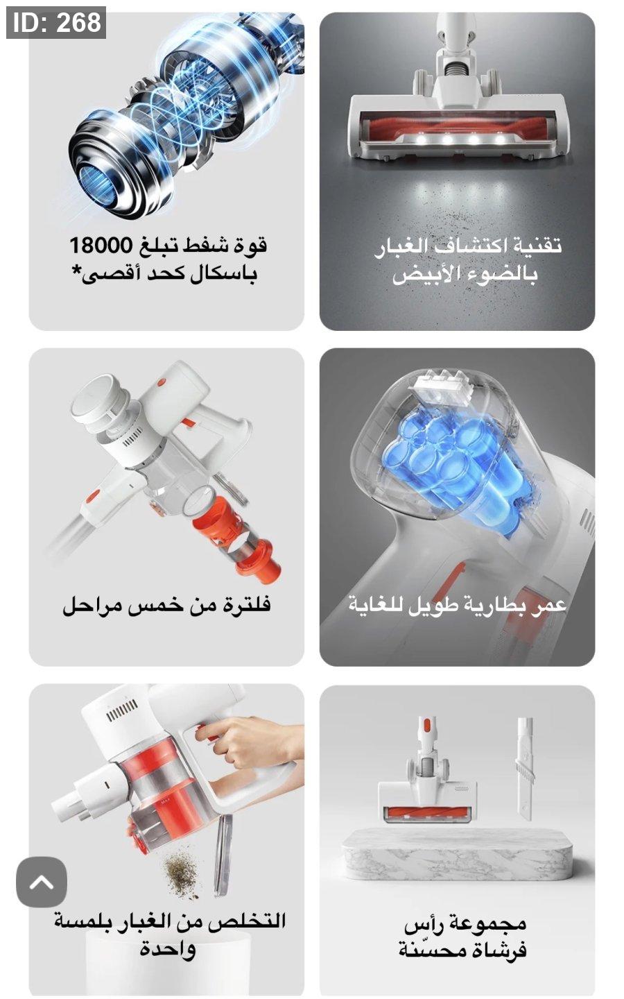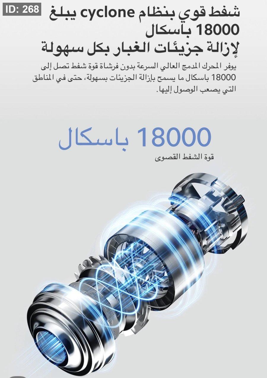 قوة شفط قوية: تتميز المكنسة بقدرة شفط تصل إلى 18,000 باسكال، مما يضمن إزالة الأوساخ والشعر والعوالق بفعالية من مختلف الأسطح.